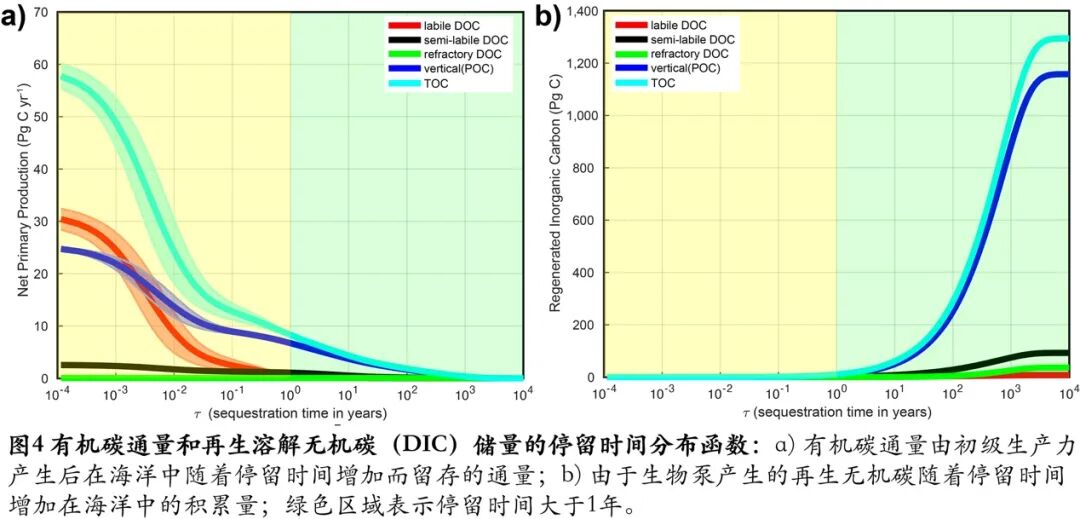 本研究进一步从碳在海洋中的滞留时间角度,提供了光合作用生成的有机碳和由生物碳泵产生的再生DIC储量对停留时间(τ)的分布函数(图 4a),首次为生物碳泵提供了时间域视角。当τ>3个月, 1年(图 4 绿色区域)和3年时,有机碳总产率分别为11.09±1.02,8.25±0.30,和6.30±0.09 Pg C yr−1。总有机碳通量主要由停留时间较短的部分主导,表明大部分有机物生产在海洋中快速循环,并不会显著影响再生 DIC 的储库(图4b)。