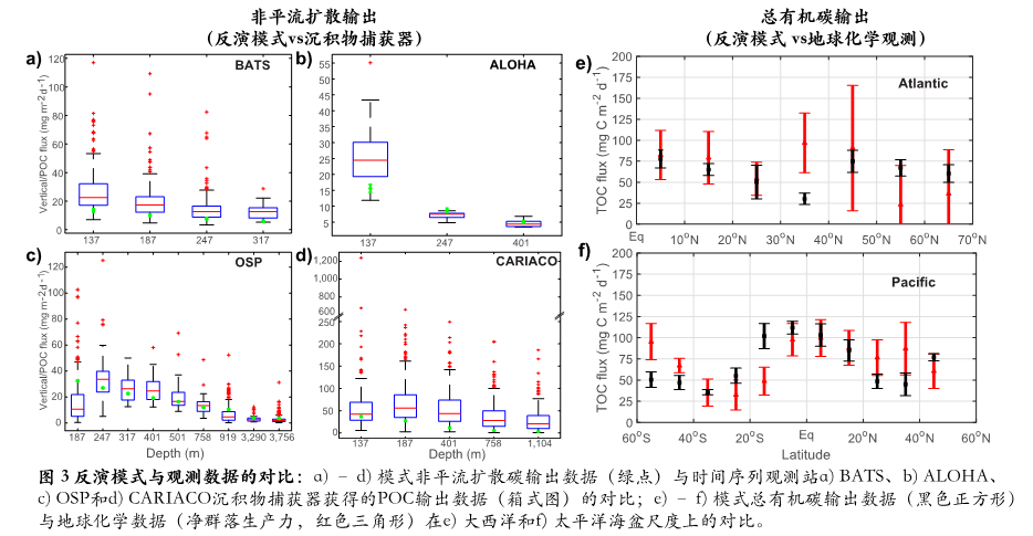 以上估算结果得到现场观测数据的有力验证。反演模式模拟的非平流扩散碳输出结果与时间序列站由沉积物捕获器得到的POC通量高度吻合(图3a-d)。模式中全路径总碳的输出也与净群落生产力(相当于总有机碳输出)在海盆尺度上的分布高度一致(图3e, f)。