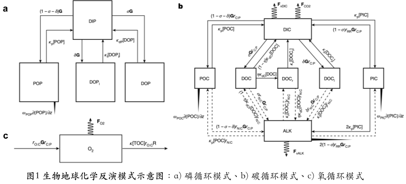 本研究基于自主研发的海洋生物地球化学逆向反演模式,通过将海洋碳、磷和氧元素的循环进行整合,建立了生物碳泵以及营养盐等参数(包括溶解无机磷DIP、溶解无机碳DIC、总碱度ALK、氧气O2和溶解有机碳DOC)的反演关系(图1)。主要的创新点在于,由水文参数的分布反推生物泵通量,避免了对海洋生物碳泵具体过程的直接模拟。这是由于当前对生物泵具体过程的认知不足且观测数据少,易造成过度参数化和对同一过程的重复计算。而反推生物碳泵通量的理论支撑为:无论有机碳以何种路径输出,它必然影响水文参数的分布,如果能准确模拟上述水文参数,便可以反推有总有机碳通量。