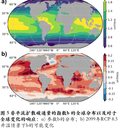 研究发现,指征POC衰减速率的马丁曲线指数b值与海表温度的线性相关(图5a)。可能的原因包括较高的温度促进再矿化和增强水体层化等机制,而温度随纬度的梯度分布可以作为各过程的综合指征物(proxy)。如果假定这一温度依赖性在未来仍然存在,基于2099年RCP 8.5排放情景下的海洋温度变化,预期全球变暖将导致有机物表层循环增强(图5b中参数b值的增加),使更多的碳留在上层海洋和大气中。